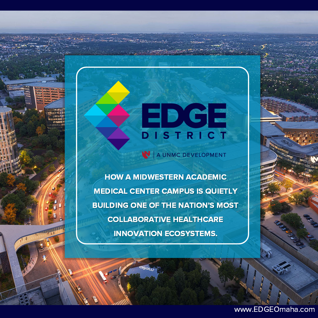 The EDGE District is a 30-acre innovation district adjacent to UNMC designed to connect research, healthcare, entrepreneurs, and industry in one collaborative environment where ideas can grow into companies, partnerships, and real-world impact.