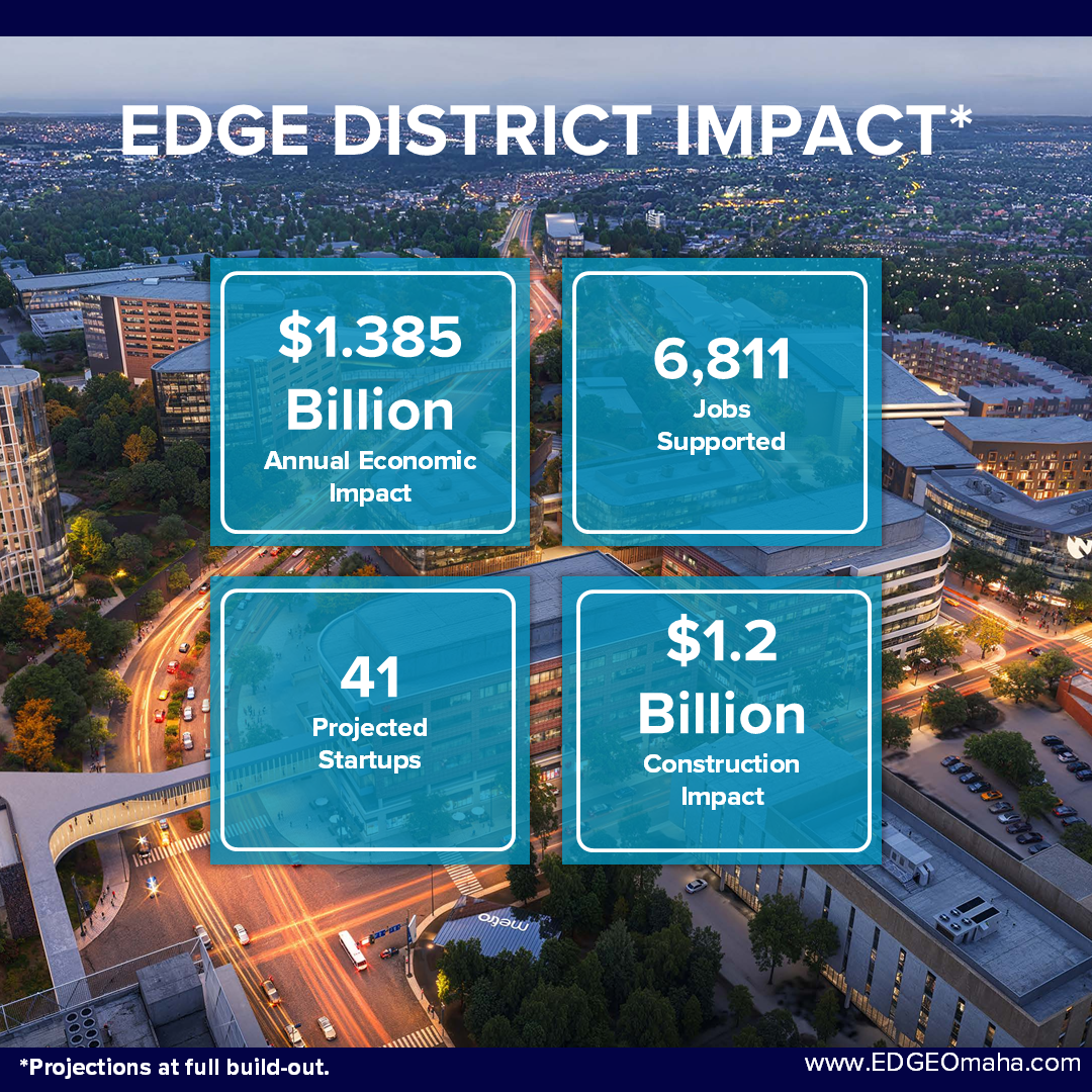 The EDGE District's phase I development projects represent over $350 million in investment, with more than 1,500 projected new jobs and 30 acres of developable urban land anchored by UNMC. This factsheet captures the scale, momentum, and impact of Omaha’s emerging health innovation district - a community built for collaboration, entrepreneurship, and sustainable growth.